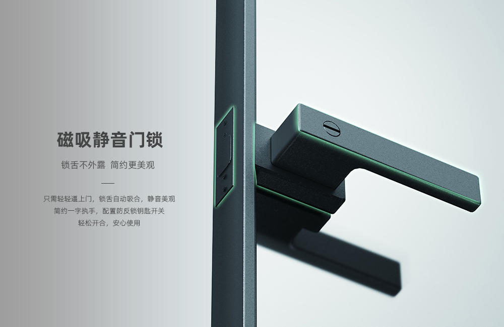 简约一字执手,框扇同质,简约更美观。磁吸静音门锁配合高弹防撞胶条,开合静音自如。每一处细节,均彰显着品质生活独有的韵味,营造出奢而不华、简而不凡的优雅生活格调。