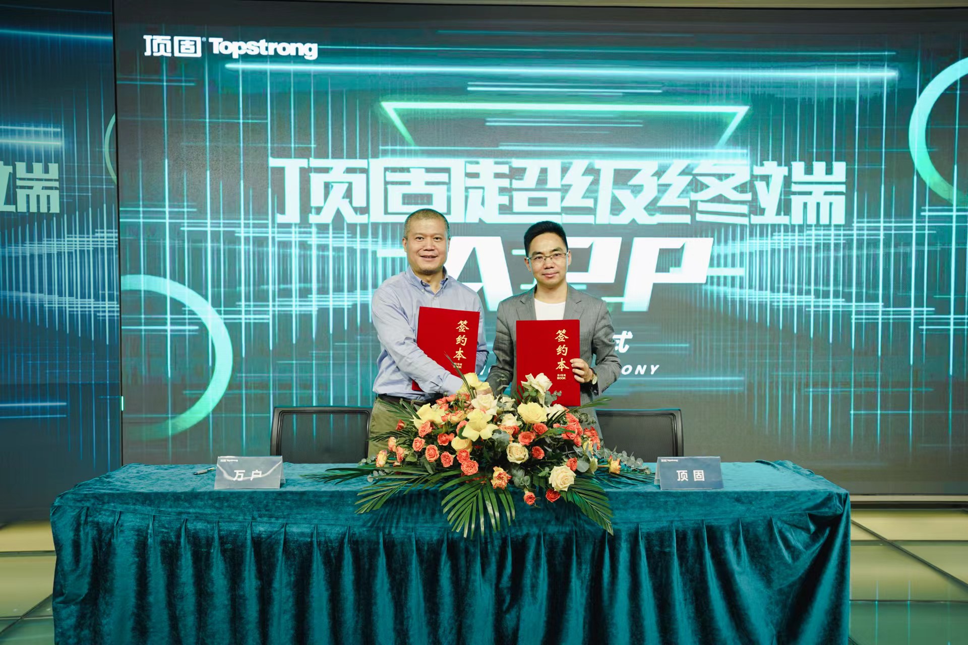 现场广东顶固集创家居与广州万户网络科技签订合作仪式,广州万户网络科技将为顶固超级终端APP提供技术及运维服务支持。