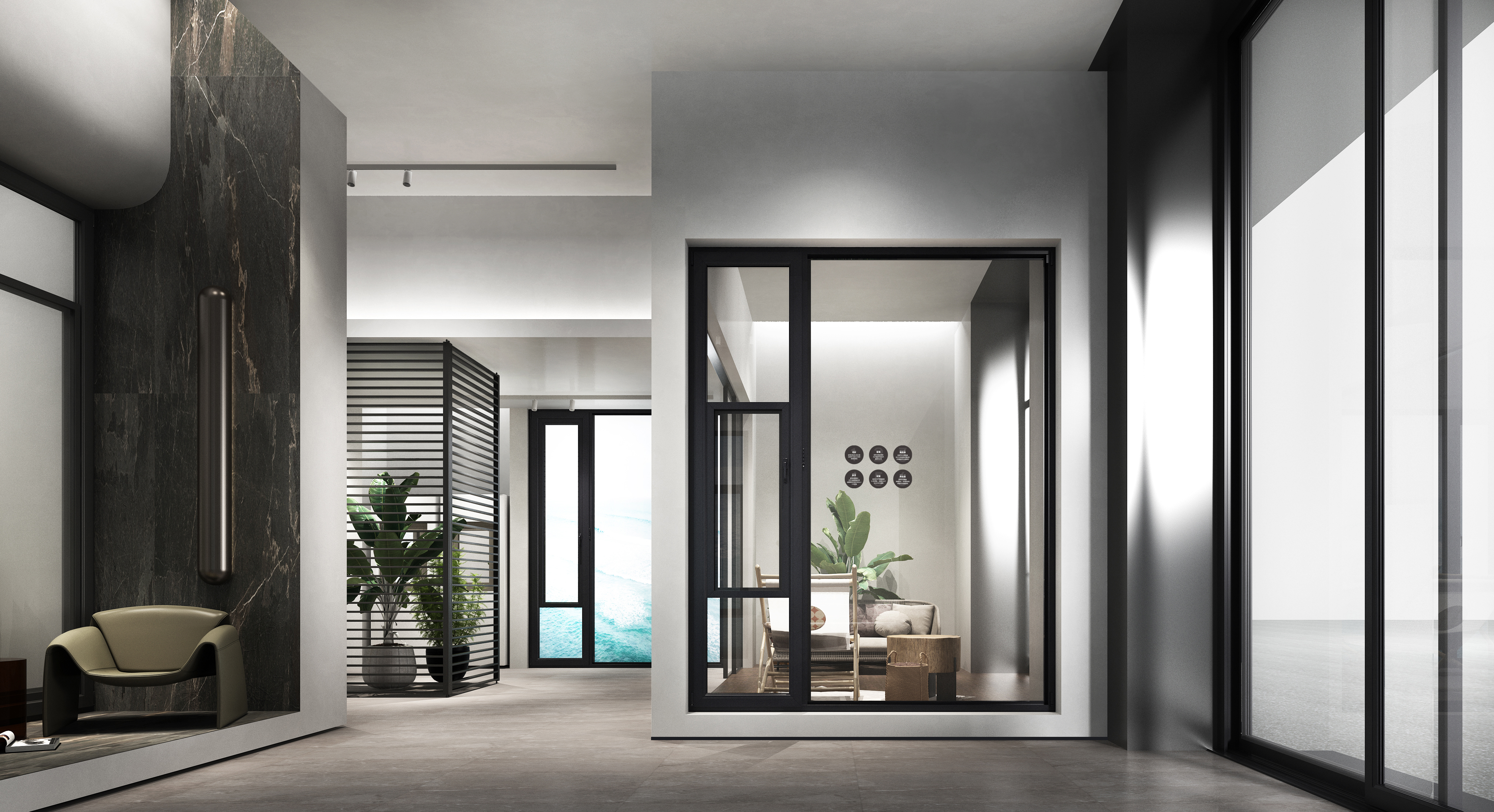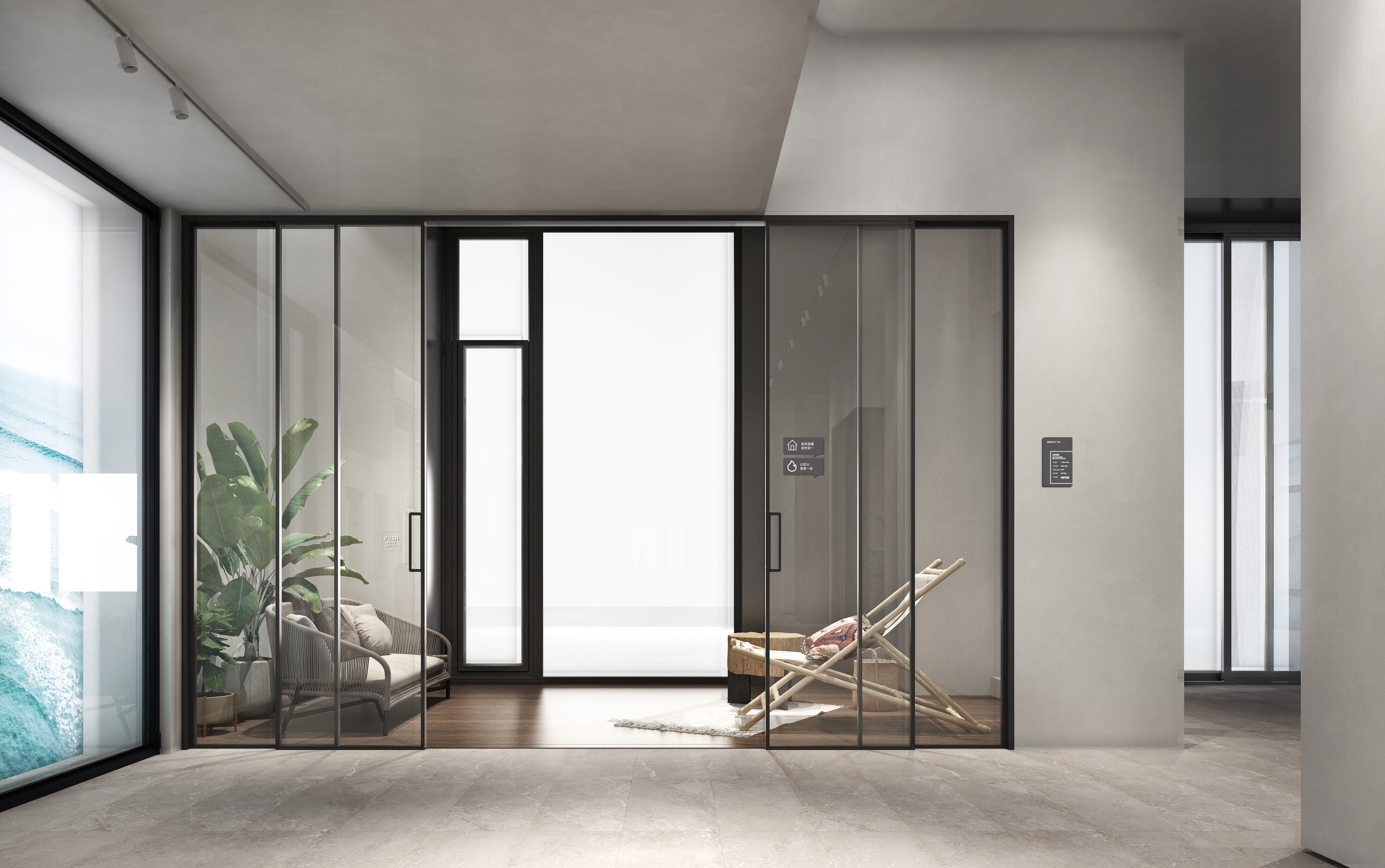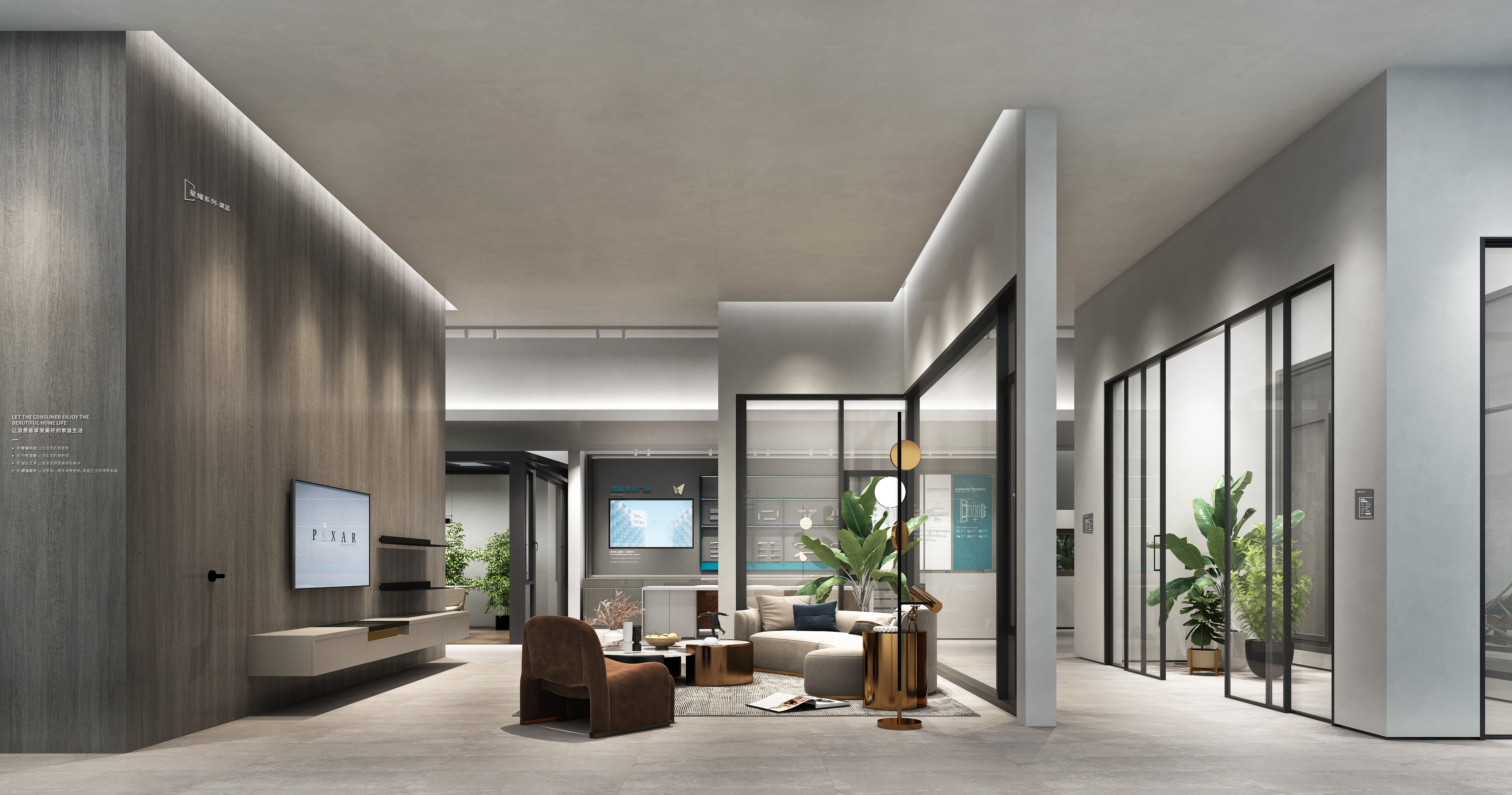展厅整体采用开放式的样间展示,围绕客厅、厨房、阳台、书房等生活场景,带人进入真实模拟空间,通过铝合金门窗、生态房门、阳光房等产品的整体搭配设计,完美呈现产品的实际效果,透过有序的空间规划、虚实相间、层层推进,俯仰间皆能感受到轻奢美学。